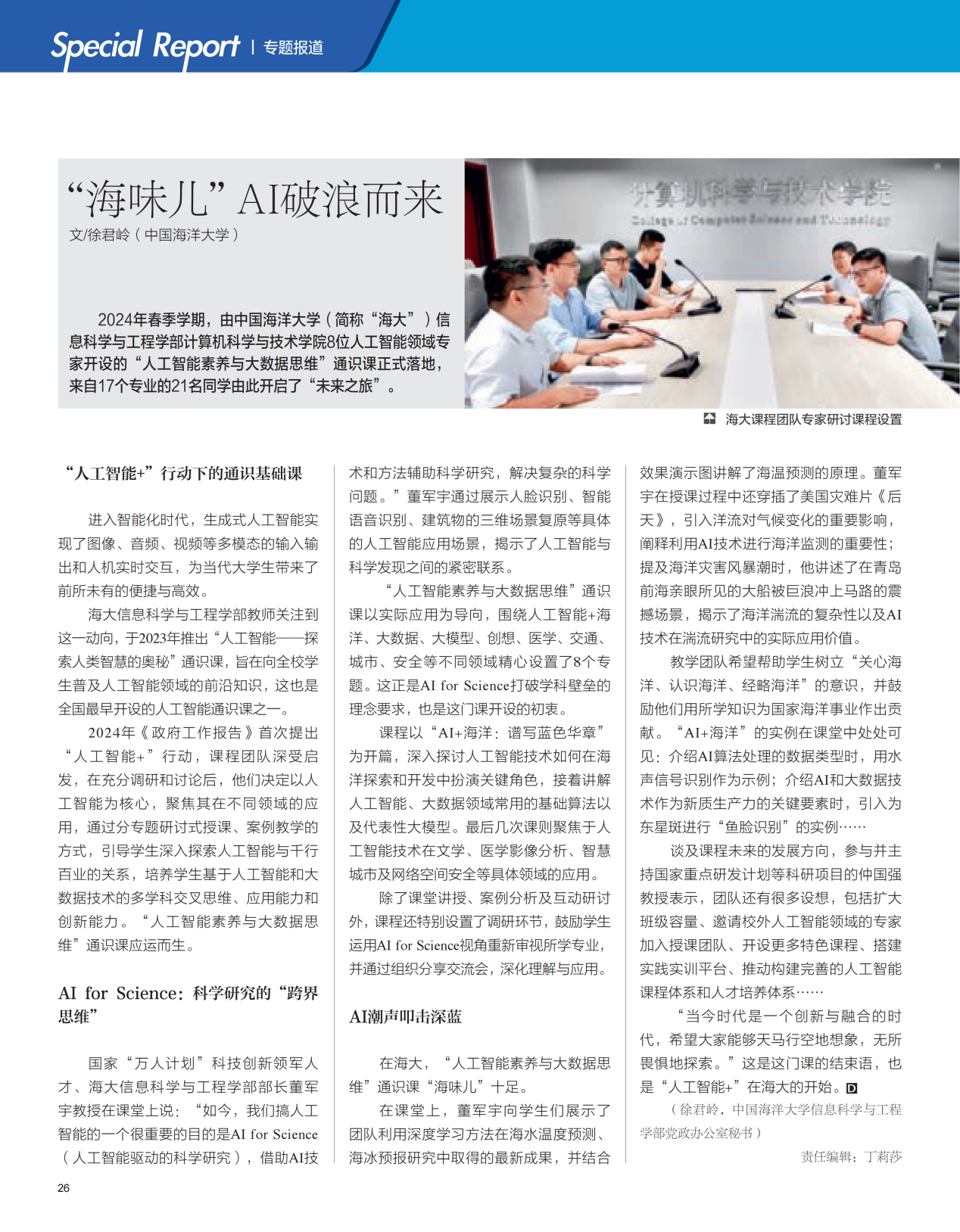近日,由中共北京市委宣传部主管,中共北京市委前线杂志社主办的《大学生》杂志刊载了文章《“海味儿”AI破浪而来》,对AV在线看 开设的“人工智能素养与大数据思维”通识课进行了报道,展现了学部在人工智能通识教育方面的生动实践和积极探索。