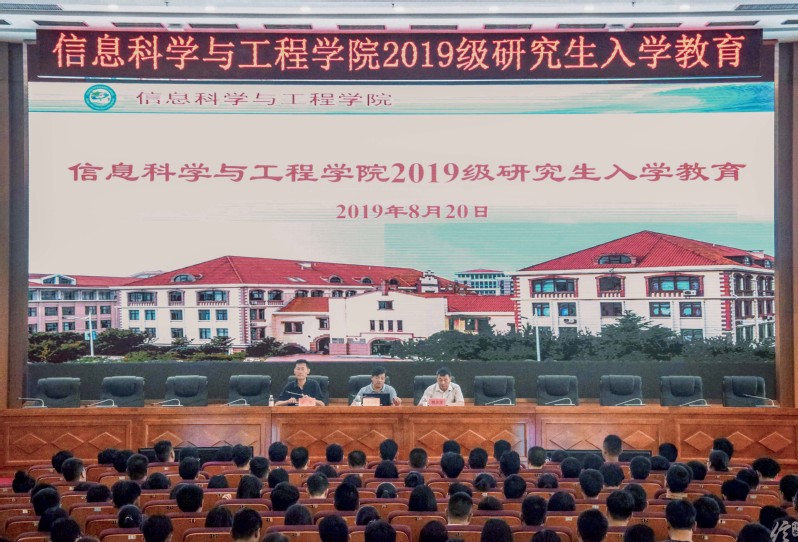 8月20日上午,信息科学与工程学院2019级研究生入学教育在崂山校区海洋科技大楼三楼国际报告厅举行。本次大会由学院党委副书记、副院长于杰主持,院长魏志强,副院长郭忠文,辅导员栾杰、袁瑜、马雪晓出席。