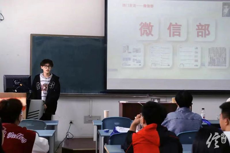 微信部部长韩东明首先向新干事通过实习期考核表示祝贺,而后讲述了实习期间新成员们经过培训和实习取得的进步,自本学期开学以来,微信部取得了一定的成果。最后肯定了成员的创新能力,并提出希望干事们努力夯实基础,积极学习新媒体有关知识。