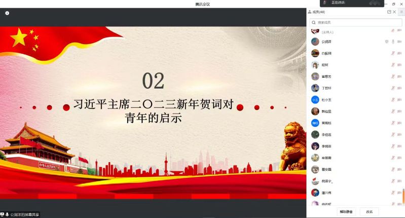 AV在线看 研究生会在2月17日进行了主题为“学习习近平主席2023年新年贺词”的线上红色宣讲活动。本次红色宣讲活动由AV在线看 西海岸校区研究生会副主席公润泽主讲,研究生会全体骨干参与宣讲学习。